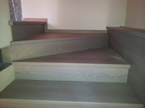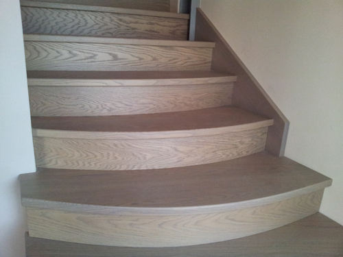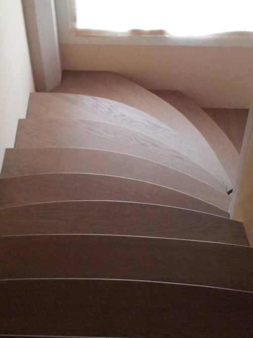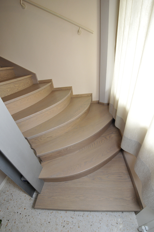 Scala in rovere con toro, con la particolarità della curvatura di alcuni gradini